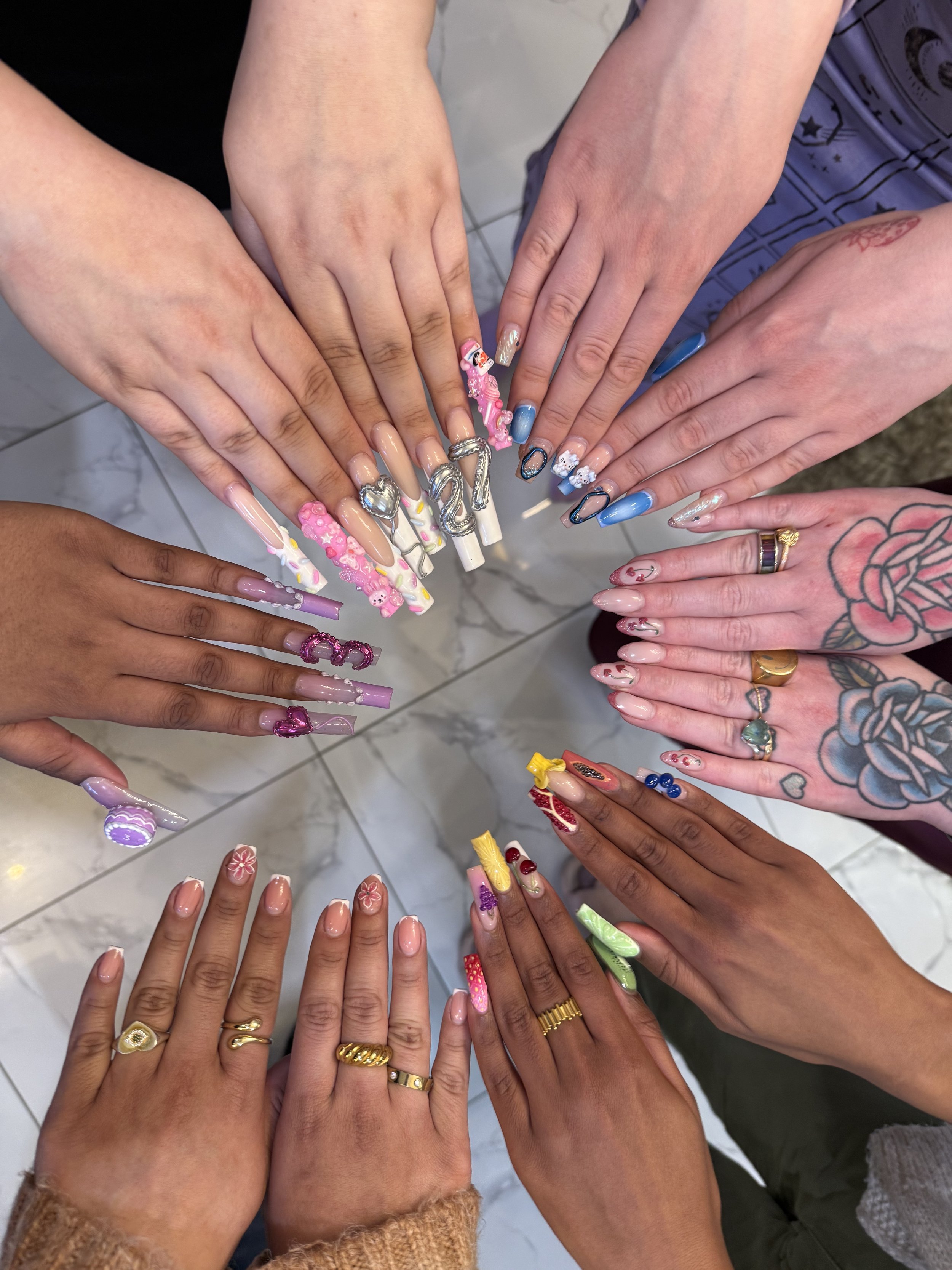 When asked to describe her style, McFarlane chooses three words: expressive, fun, and free. She doesn’t limit herself to a single aesthetic. Instead, she focuses on capturing each client’s personality. Often, clients bring her a mood board or nail inspiration. At other times, she asks for something more personal: a dress they love, constellations, or any image or theme that holds meaning for them. “I don’t think I necessarily have one set style,” she explains. “My style is kind of however I can best express my client’s personality.” She works with acrylic, polygel, gel, and Gel-X, blending her certificate training with self-taught techniques and ongoing courses. For her, formal skills and independent learning go hand in hand.